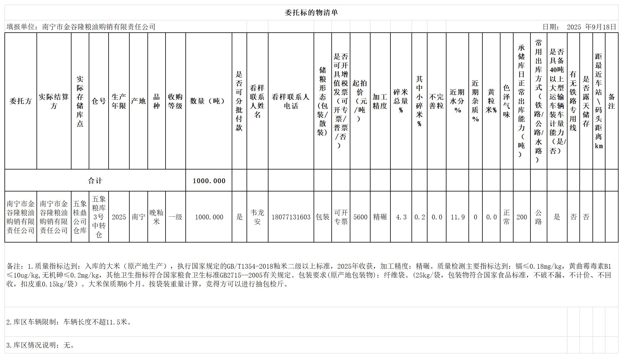 广西南宁市市辖区20250918(1)期南宁市金谷隆粮油购销有限责任公司五象粮库3号中转仓1000吨晚籼米轮换项目