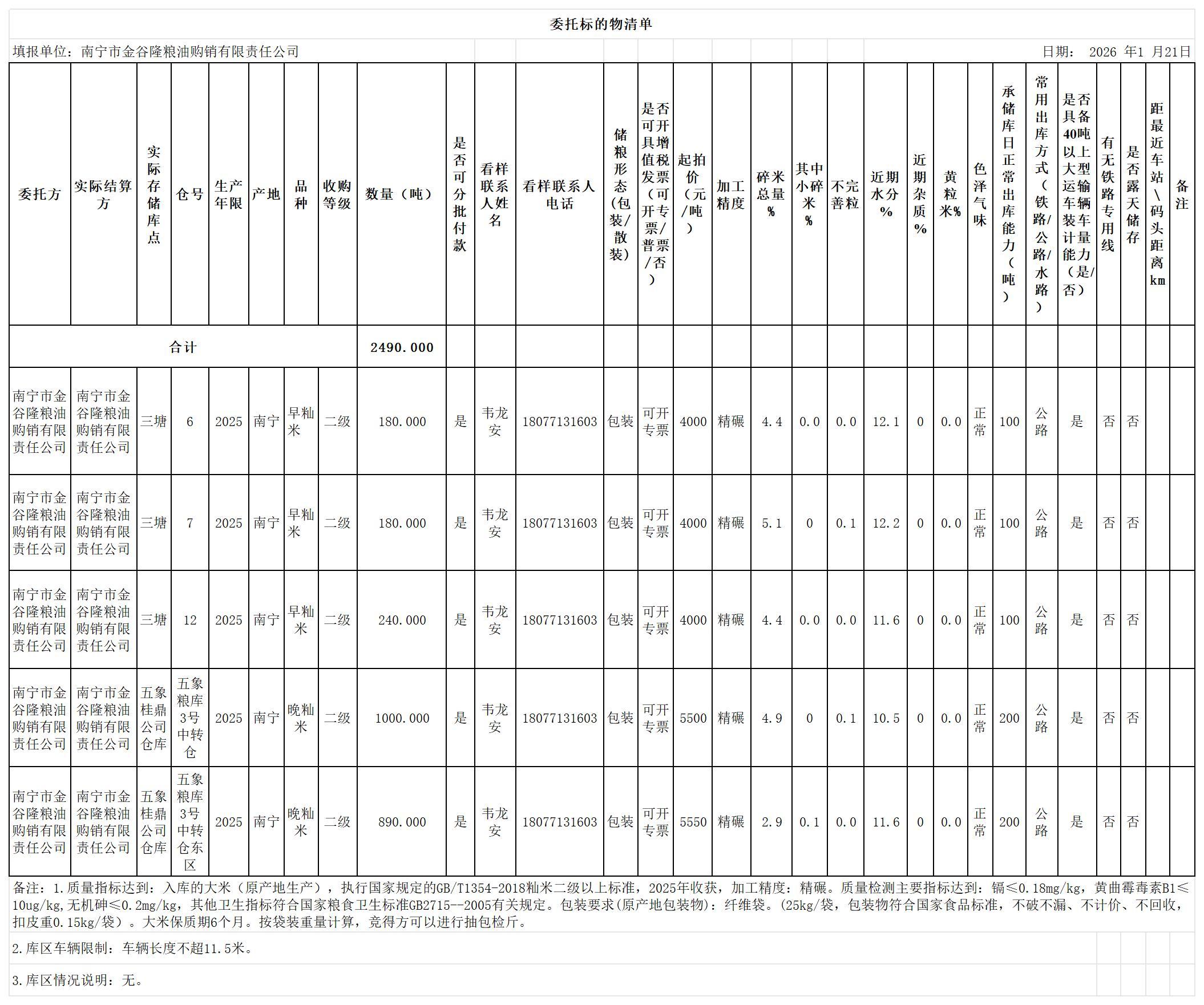 委托方(南宁市金谷隆粮油购销有限责任公司):韦龙安,18077131603(用于联系看样、交货安排、合同执行等具体业务事宜)
